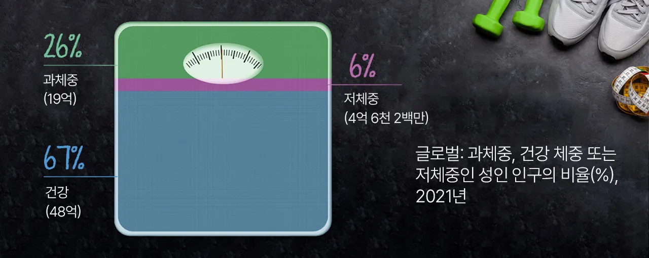 체중 관리는 수년간 사람들의 관심을 많이 받는 주제인데요, 팬데믹으로 인해 체중관리에 어려움을 느끼는 사람들은 증가하고 있습니다. 팬데믹으로 인해 패스트푸드 소비량이 증가하고, 스크린 타임과 앉아서 지내는 생활 습관이 늘어남에 따라, 한국 소비자의 41%는 팬데믹 전에 비해 현재 체중 관리를 더 어렵게 느끼고 있다고 토로했습니다.